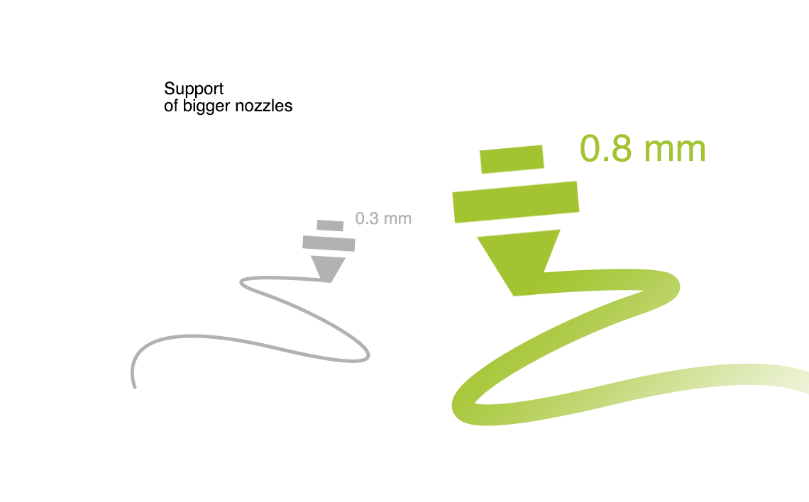 A bigger nozzle allows covering the surface widely and filling up the model with plastic after less number of passes. A 0.8 mm nozzle prints a part two times faster than 0.3 mm nozzle.