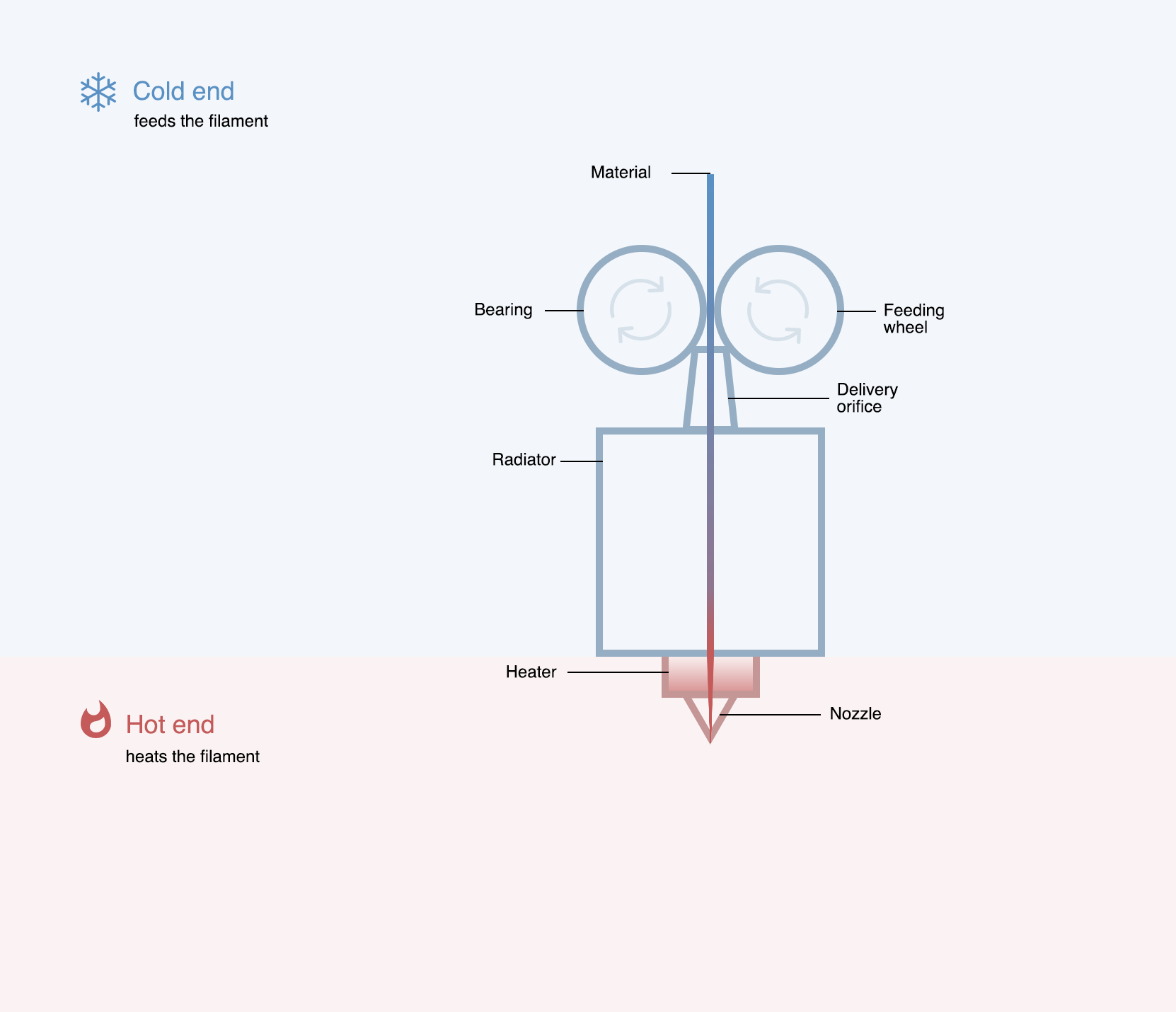 The print head consist of two units: cold end, which feeds filament; hot end, which heats the filament.